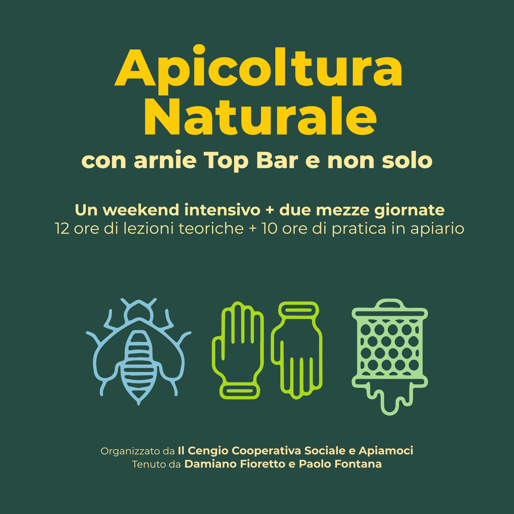 12 ore di teoria e 10 ore di pratica. Un weekend intensivo il 18 e 19 aprile, due mezze giornate di sola pratica in apiario il 27 giugno e il 19 settembre 2026.